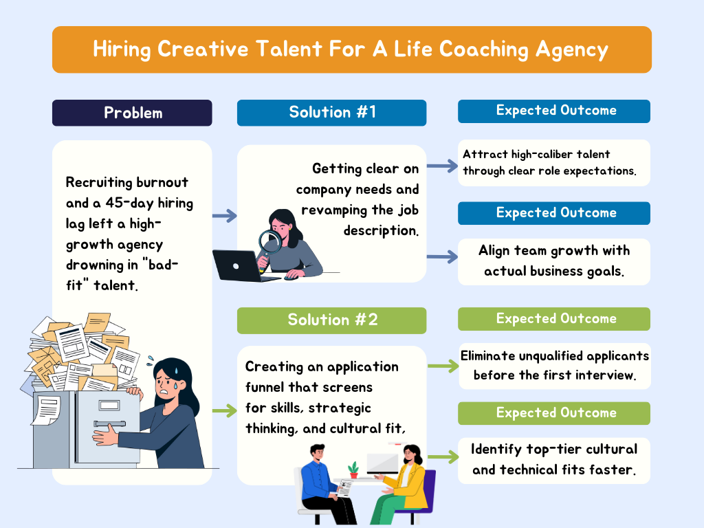 A high-growth, quirky life coaching agency was struggling with a broken hiring process. They were overwhelmed by unqualified applicants, leading to recruiter burnout and a 45+ day time-to-hire. Most recently, they were forced to let go of a new editor who missed their first two deadlines, leaving the team behind schedule and overwhelmed with the hiring process.